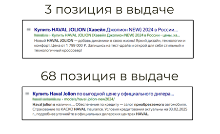 Например, если по запросу «купить Haval Jolion в СПб» большинство пользователей выбирают страницы с актуальными ценами, фото и кнопкой записи на тест-драйв, система делает вывод: именно такой формат наиболее релевантен.