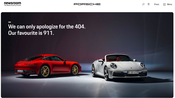 Некоторые компании добавляют на страницу 404 элемент юмора или креатива — это работает, если соответствует тону бренда. Отличный пример есть у Porsche, в котором они ссылаются на название популярной модели (Porsche 911)::