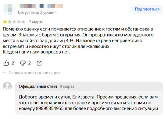 Ниже — пример отработки негатива. Человек вывел в общее поле не конкретную жалобу, а описал общие негативные впечатления. Представитель своим ответом показал готовность разбираться и решать проблему.