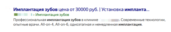 Представьте выдачу по запросу «имплантация зубов СПб». Если у одного сниппета написано «Имплантация зубов — стоматология в центре», а у другого — «Имплантация зубов: цена, фото до/после, консультация бесплатно». Очевидно, пользователь выберет второй.