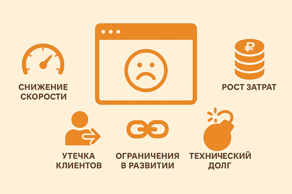 - Ограничения в развитии — сложно запускать новые фичи, интеграции, адаптироваться к требованиям бизнеса.