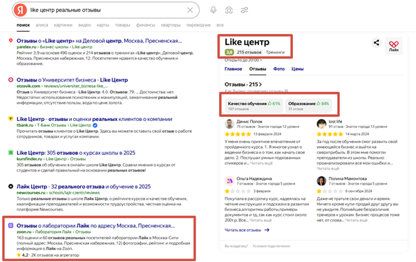Ниже — пример качественной работы по направлению SERM в поисковой выдаче.