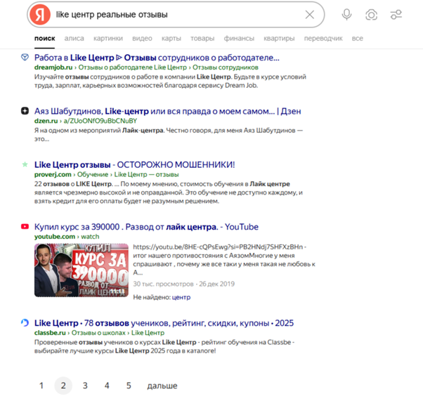 Вернемся к примеру с Like центр. Если на первой странице выдачи всё было гладко (по мере возможности), то на 2 странице и далее — преимущественно негатив, который вытеснили:
