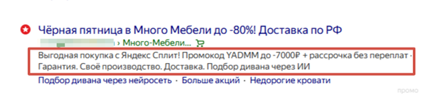 Если у вас действительно хорошая цена или выгодное предложение — покажите это через уточнения. «Цена от 5000 ₽», «Рассрочка 0%», «Скидка 20% при онлайн-оплате». Это работает, если ваше предложение реально лучше рынка. Если нет — лучше делать упор на другие аргументы.