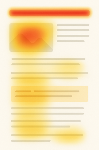 И не забывайте про то, что большинство страниц не читают целиком. Старайтесь сохранить опцию «пробежаться глазами и понять суть». Вот как выглядит примерная тепловая карта взгляда читателя. Чем ярче точка – тем больше внимания уделяется этому месту:
