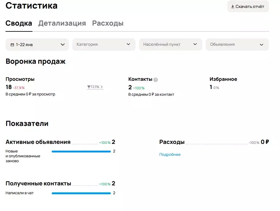 Клиент обратился с запросом на оптимизацию профиля Avito. Попытки самостоятельного продвижения не приносили ожидаемого количества заявок. Статистика за 22 дня до начала работ:
