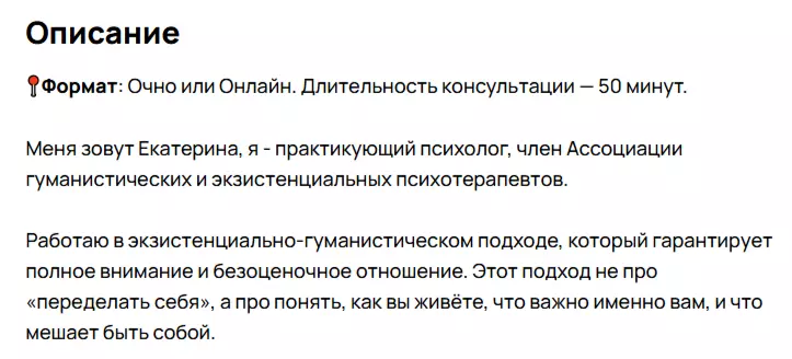 Профиль: добавили качественные фото Екатерины, составили описание, раскрывающее компетенции и подход.