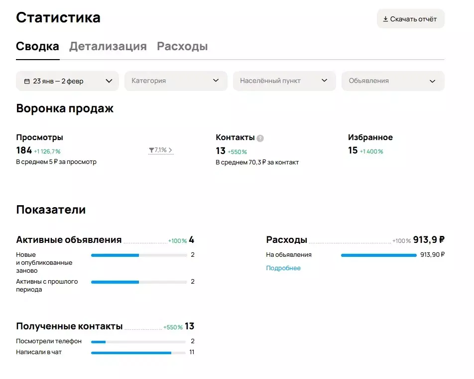 За 11 дней мы вышли на стабильный поток заявок при символическом бюджете. Стоимость одной заявки составила всего 38 рублей. При общих расходах на продвижение в размере 913 рублей клиент получил 24 целевых контакта.