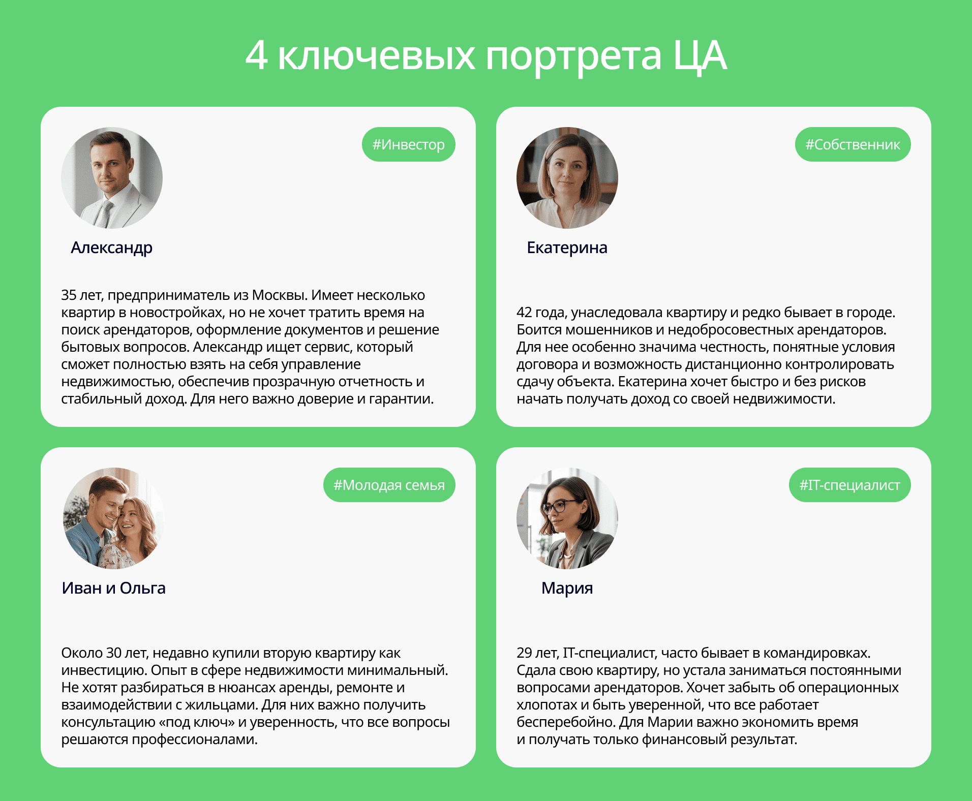 Целевая аудитория — это современные собственники и инвесторы, для которых главное в управлении недвижимостью — надежность, прозрачность и отсутствие лишних забот. Мы работаем для тех, кто ценит свое время, стремится к максимальной доходности своих объектов и хочет быть уверенным, что их жилье всегда под контролем профессионалов.