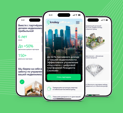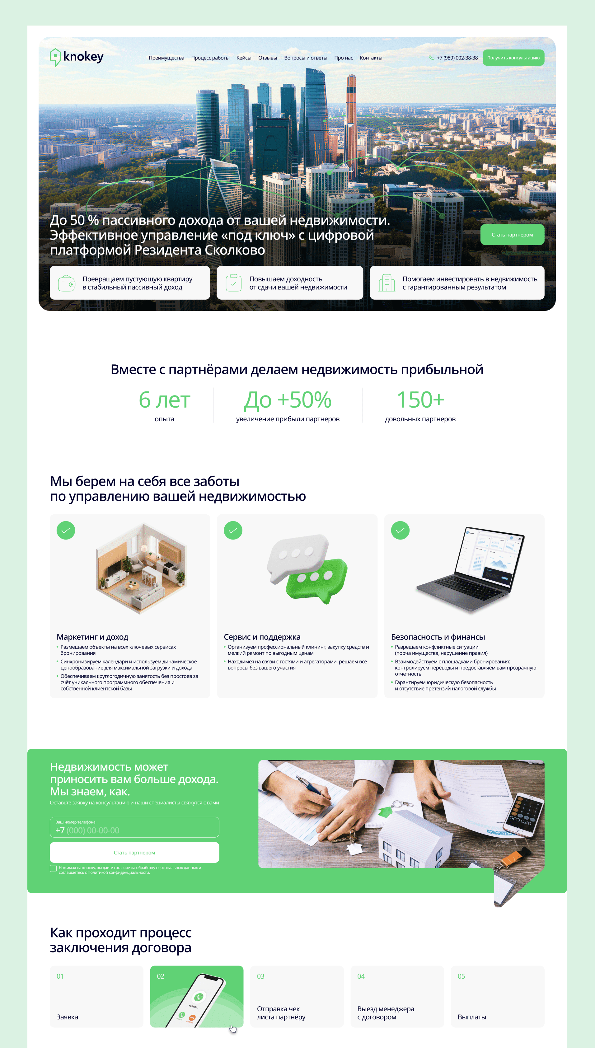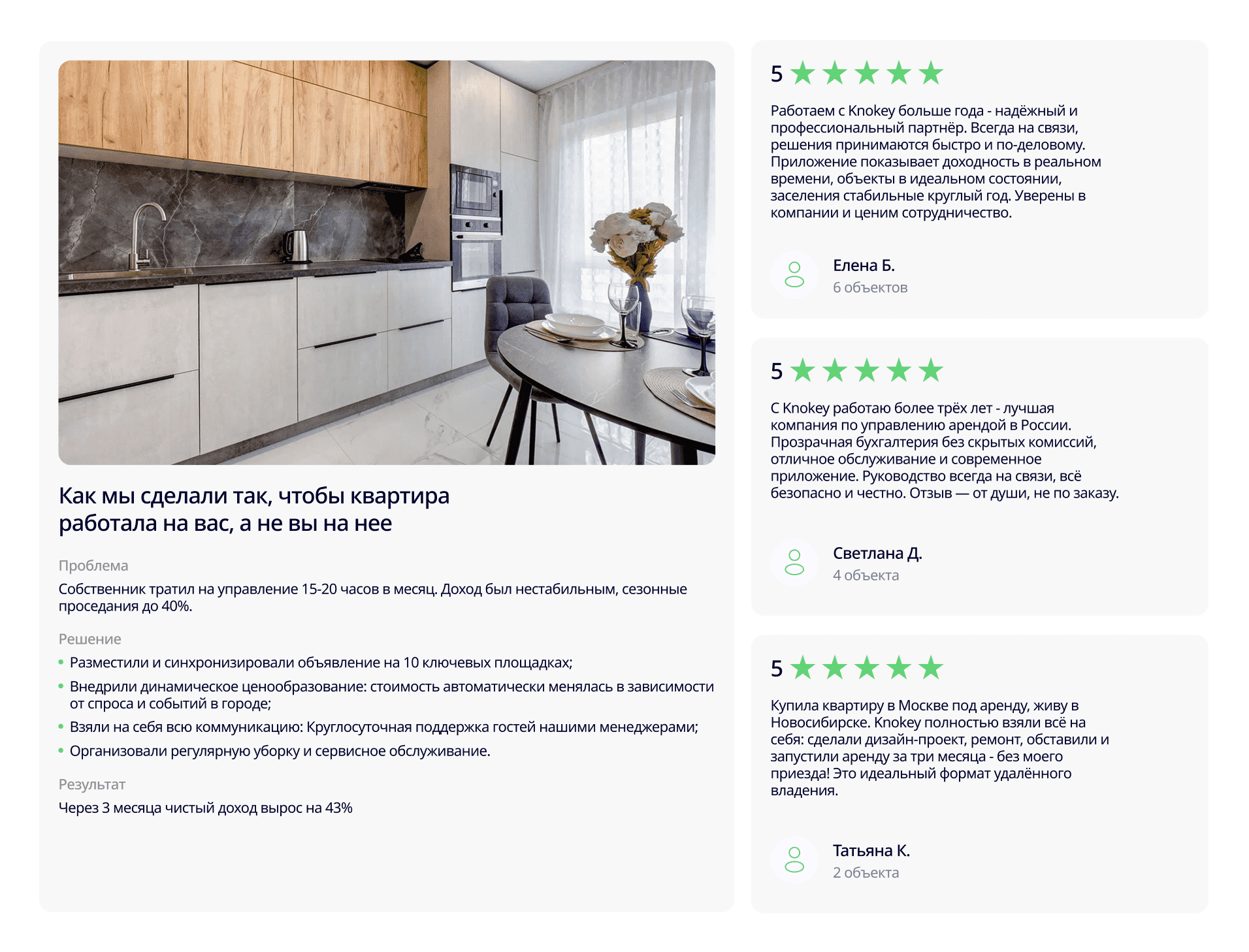 На лендинге размещены отзывы клиентов, а также логотипы известных партнёров. Продуманный раздел с примерами ситуаций, в которых «Кнокей» реально решает задачи владельцев недвижимости.